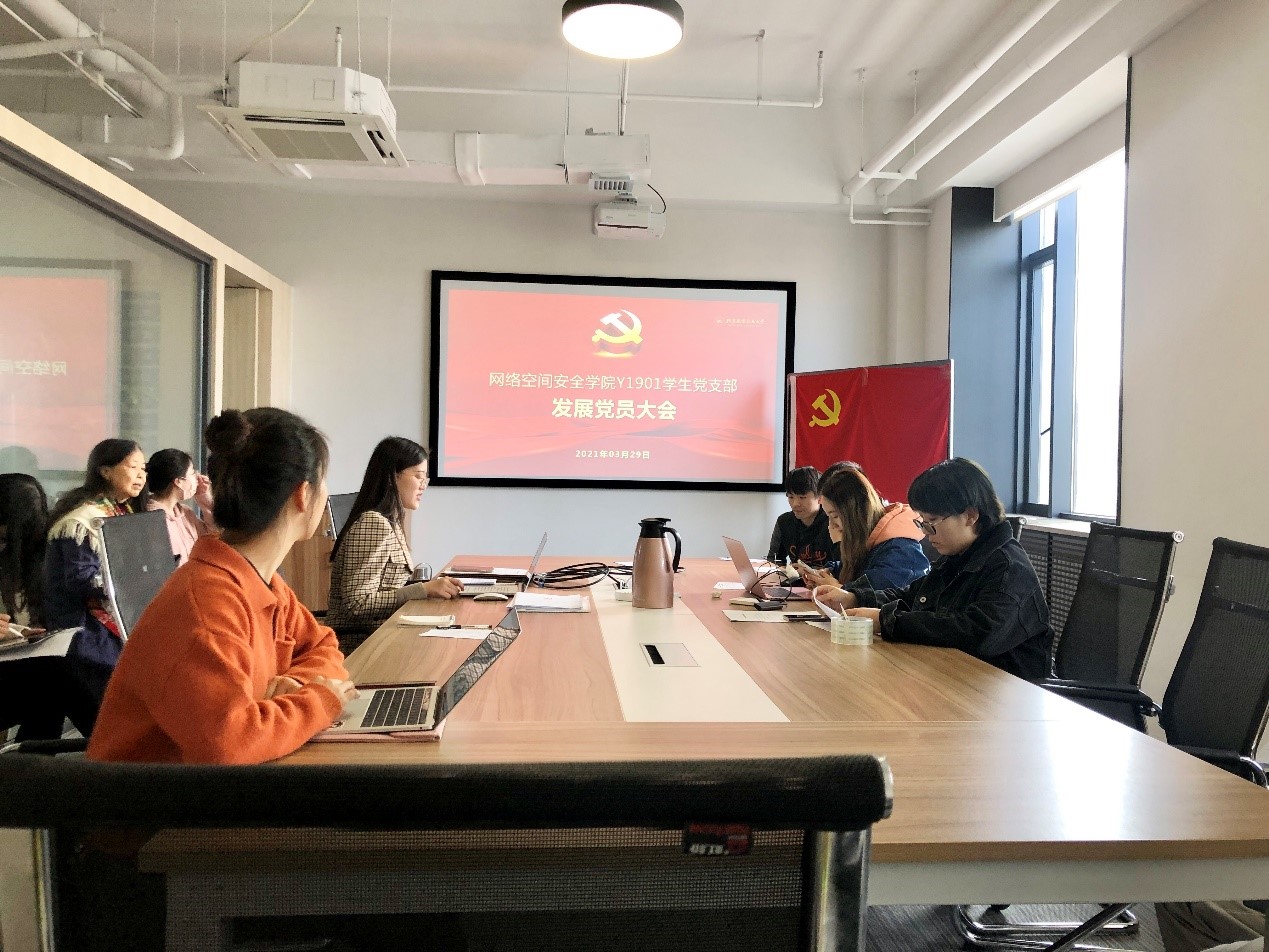 2021年3月29日下午13时30分,北航网络空间安全学院Y1901学生党支部在一号馆408会议室召开支部党员发展大会,讨论能否接收李彤、敦明、温永晴、夏羽4名同志为中共预备党员。本次大会由党支部书记徐子钧主持,党建特邀组织员邓彦敏老师、专职组织员王倩云老师、专职辅导员杜逸雯老师列席本次会议。支部党员应到12人,实到10人,江廷宇和辜智强2名党员同志因校外实习请假,二人已提前向党组织提交表决是否接收预备党员的书面意见。