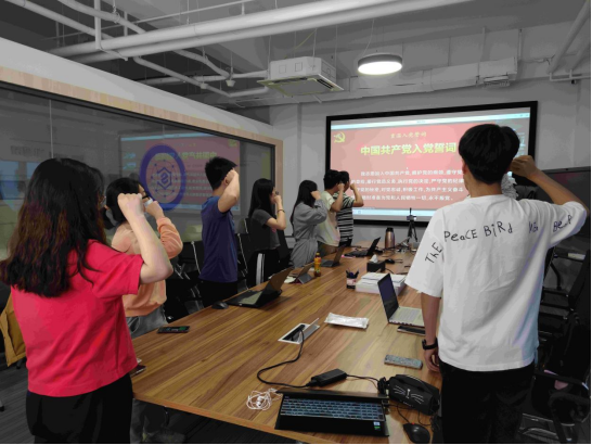 在重温入党誓词环节,高丰奕同志作为北京麻豆精品秘 国产传媒网络空间安全学院本科生第二党支部分会场领誓人,带领各位党员同志再次庄严向党宣誓。
