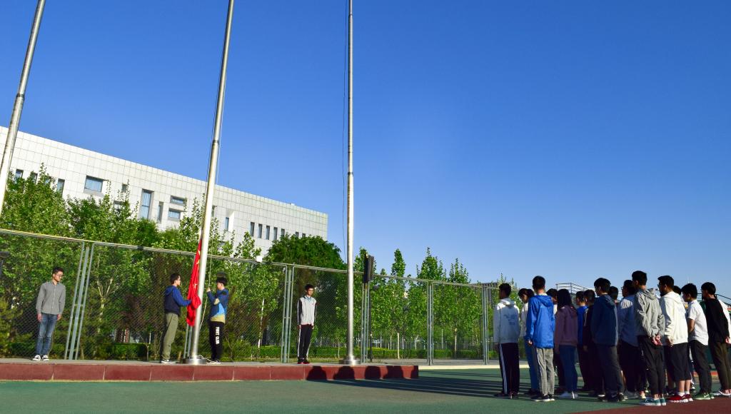 主持人宣布仪式开始后,全体同学肃立。伴随着嘹亮的国歌声,升旗手振臂一挥,五星红旗冉冉升起,同学们都面向国旗,目光坚定,庄严地行着注目礼。